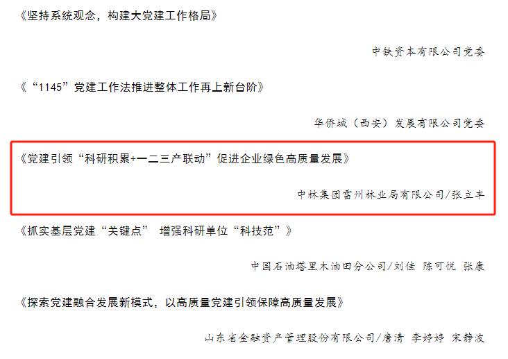 近日,《国企》杂志编辑部公布2023年度“国企党建理论研究”等相关优秀作品及“国企党的基层组织建设”优秀案例名单,其中,来自中林集团的两篇作品——中国林业集团有限公司党委《把主题教育成果转化为助推美丽中国建设的生动实践》和中林集团雷州林业局有限公司《党建引领“科研积累+一二三产联动”促进企业绿色高质量发展》荣登国企党建经验交流优秀作品名单。