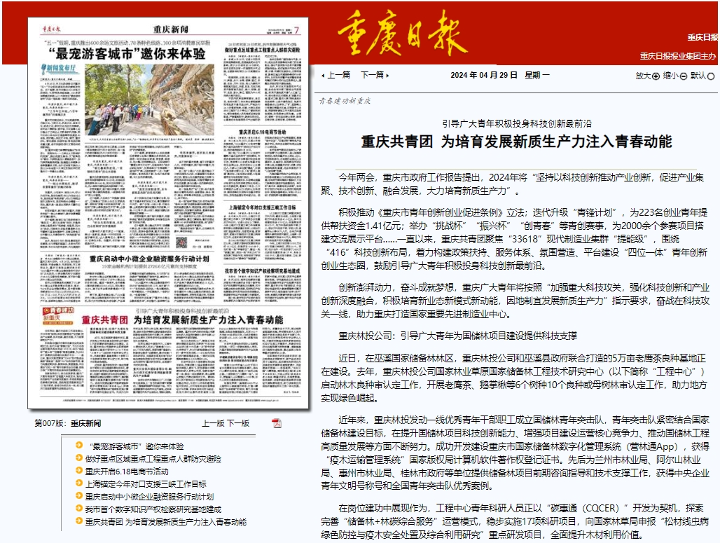重庆日报聚焦林投青年为国储林项目建设提供科技支撑,作题为“重庆共青团 为培育发展新质生产力注入青春动能”的报道,刊登于重庆日报2024年4月29日重庆新闻第7版。