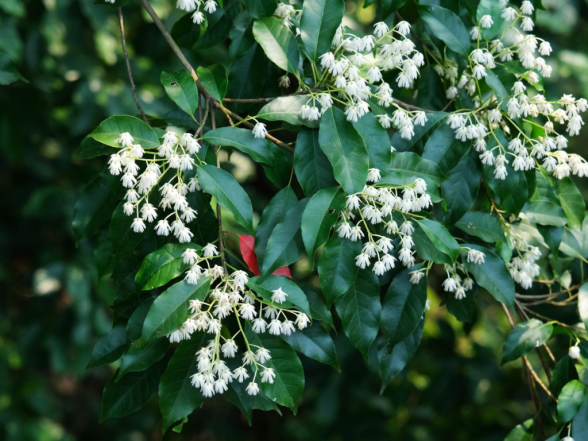 花期在4-8月,不同地区略有差异,南方温暖的地方花期4-5月,稍冷的地方要等到6-8月。花不算大,但胜在数量多,满树黄白色的小花热热闹闹地开着,放眼望去也好似一片白色海洋。果实10-12月成熟,由青绿慢慢变成暗紫色,熟透后会自然脱落。