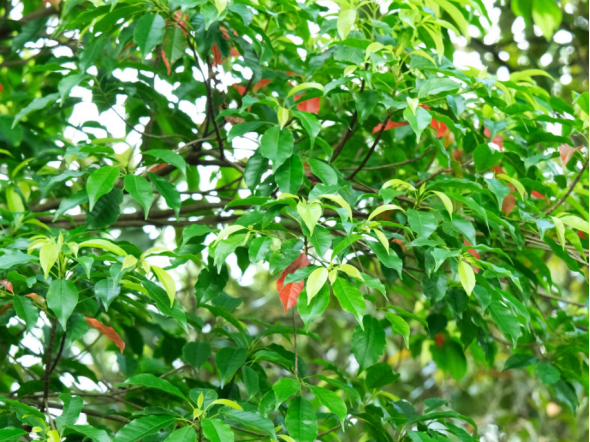 山杜英的主干笔直挺拔,高可达18米,胸径能长到38厘米以上。树皮淡灰或黄灰色,小枝纤细光滑,老枝则呈暗褐色,透着几分岁月的痕迹。树冠呈尖塔形,冠层厚密,顶端优势明显,一眼就能认出来。叶子呈纸质,倒卵形或倒披针形,边缘带着钝锯齿或波状钝齿。叶面深绿光亮,叶背颜色稍浅,两面都光滑无毛,摸起来手感很清爽。一年四季总能在树冠中看到几片红叶点缀其间,霜后红叶更多,红绿相间,像给大树戴上了一串红玛瑙项链,平添几分风韵。花朵总状花序从枝顶的叶腋里垂下来,花朵白色,花瓣上半部分撕裂成流苏状,像一把把细碎的小刷子,别致又耐看。果实是椭圆形的核果,成熟时由绿转暗紫,像一串串迷你的紫葡萄挂满枝头。