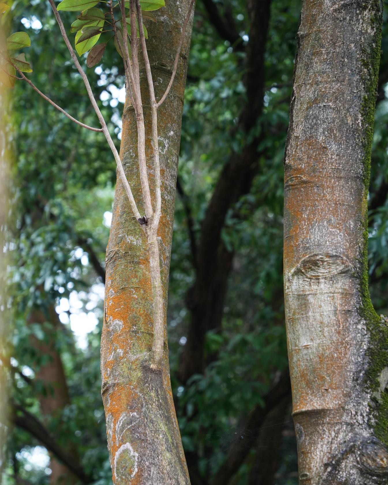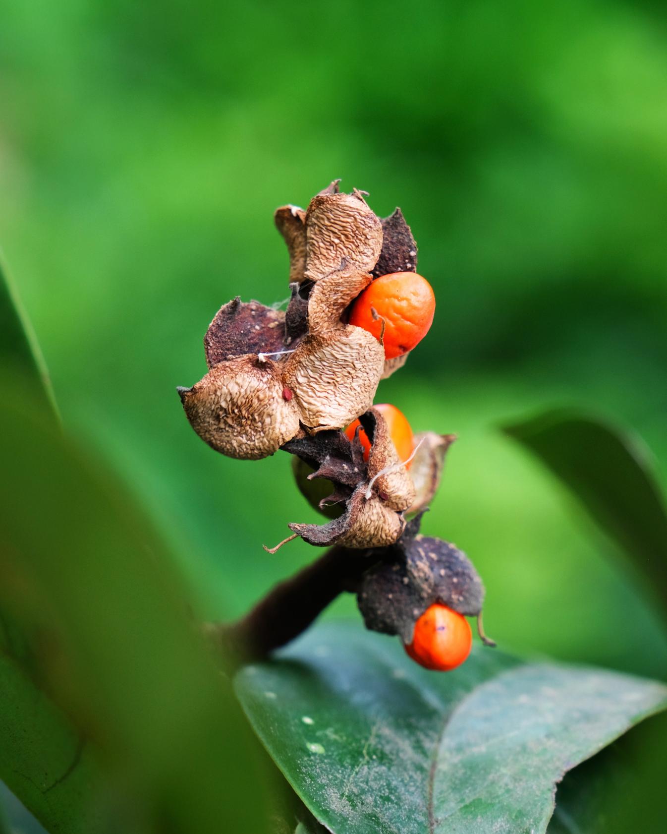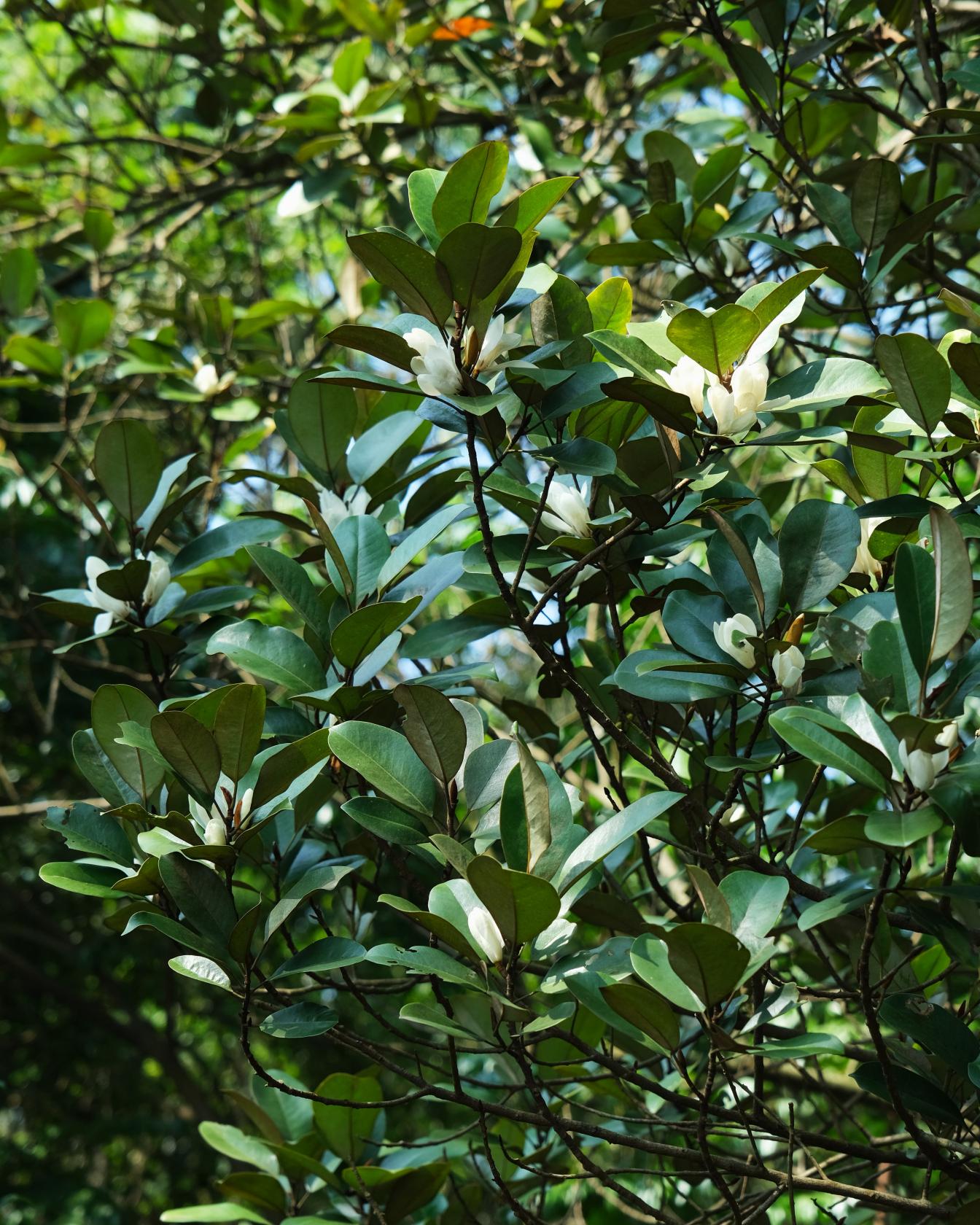 树高可达30米,胸径将近1米,树干笔直挺拔,树冠撑开如一把巨伞。树皮灰白色,光滑平整,不像很多老树那样沟壑纵横。嫩枝、芽、叶柄甚至花梗上都披着一层红褐色的短绒毛。叶片为革质,倒卵形或椭圆状倒卵形,长7—14厘米,边缘平滑无锯齿。叶面深绿光亮,叶背颜色稍浅,被一层灰色绒毛夹杂着褐色短毛,侧脉每边10—15条,细密如织。花是它的“招牌”。每年春天,白色花朵从叶腋间探出头来,有时单生,有时两三朵簇拥在一起。花被片通常9片,外轮宽大、内轮渐小,层层叠叠如白色小勺;最特别的是花丝是鲜红色的,红白相映,在一片素雅中透出一抹艳色。花开时香气浓郁,隔远便能闻到,“醉香”二字名副其实。果实是聚合蓇葖果,若干枚小果聚生在一个果蒂上,表面疏生白色皮孔。成熟时果壳沿腹背缝裂成两瓣,露出里面的鲜红色种子,形如孩童张开的小嘴,颇为可爱。