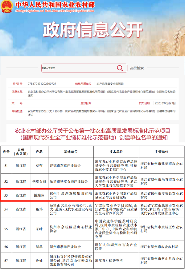 日前,农业农村部办公厅公布了第一批农业高质量发展标准化示范项目(国家现代农业全产业链标准化示范基地)创建单位名单,中林千岛湖发展有限公司凭借着在有机鲢鳙鱼全产业链标准化方面的不懈探索和实践成为首批入选的企业,这也是浙江省获批创建的8个示范基地中唯一的淡水企业。
