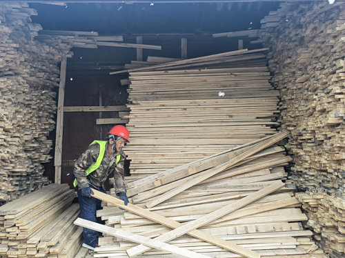 质量管理 测量先行 林场集团所属大连中林投资有限公司业务部职员正在检尺圆木,以确定规格,进行准确分类。(摄影:欧阳莹)