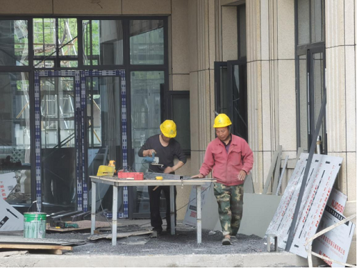 凝心聚力 铸就品质 林场集团所属成都市中林投资发展有限公司建设项目——成都青白江铁路港木材物流基地,工人正在对综合楼墙面的门窗进行加工作业。(摄影:管思远)