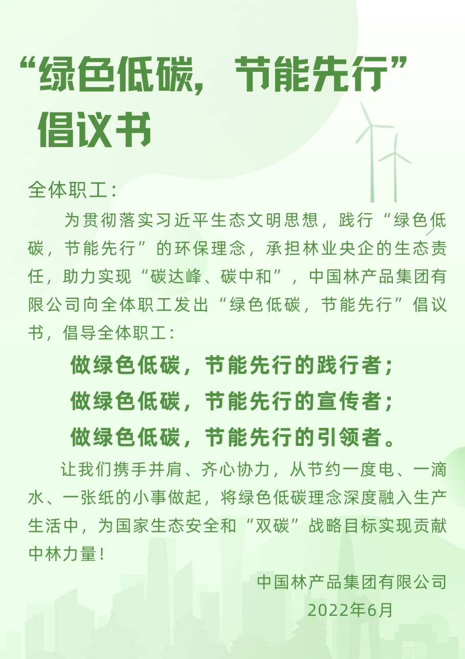 林产品公司依托全国节能宣传周发布《“绿色低碳,节能先行”倡议书》,倡导全体职工带头做绿色低碳、节能先行的践行者、宣传者、引领者;同时,利用微信公众号分享绿色低碳生活方式,号召大家从节约一度电、一滴水、一张纸的小事做起,将绿色低碳理念深度融入生产生活中,为国家生态安全和“双碳”战略目标实现贡献坚实力量。(刘佳会)