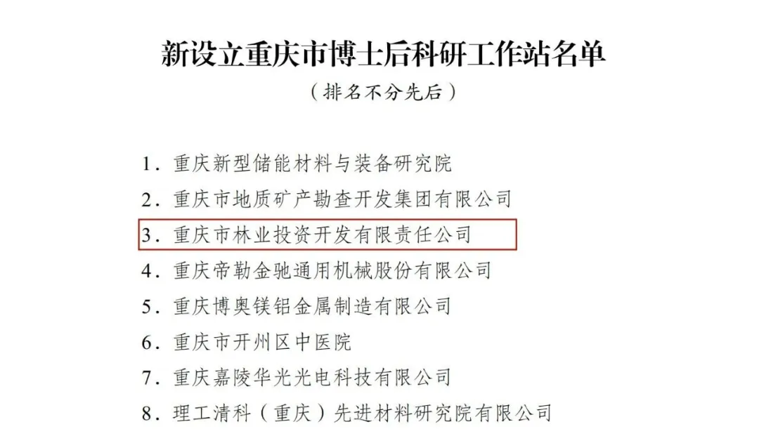 截至目前,重庆林投成功获批设立博士后科研工作站和两个市级重点实验室,成功挂牌建设国家林业草原国家储备林工程技术研究中心,完成一系列国储林建设行业、地方和企业标准的编制,取得多项科研专利,主持开发的重庆市首个国储林“碳惠通”项目顺利通过市生态环境局备案并完成开户工作。