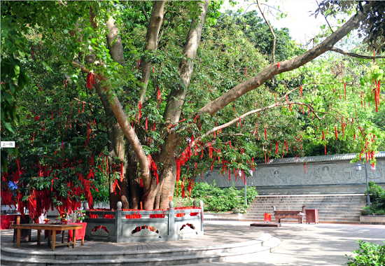 这棵阴阳合一的因缘菩提树(拉丁学名:Ficus religiosa L.)就在良凤江公园里,细心的人很容易发现,其根部酷似一对金童玉女相倚而立蕴藉灵气。它兼具阴柔、阳刚之美,这是国内难得的阴阳合一菩提树,有着“天下奇树”之称,因此菩提文化苑成为了南宁群众求学祈福、寄托美好愿望的胜地之一。菩提树的枝头常常系满了用红绸布制作的“许愿带”,满树的红丝带写满了愿望,每逢节假日,必定游人如织。