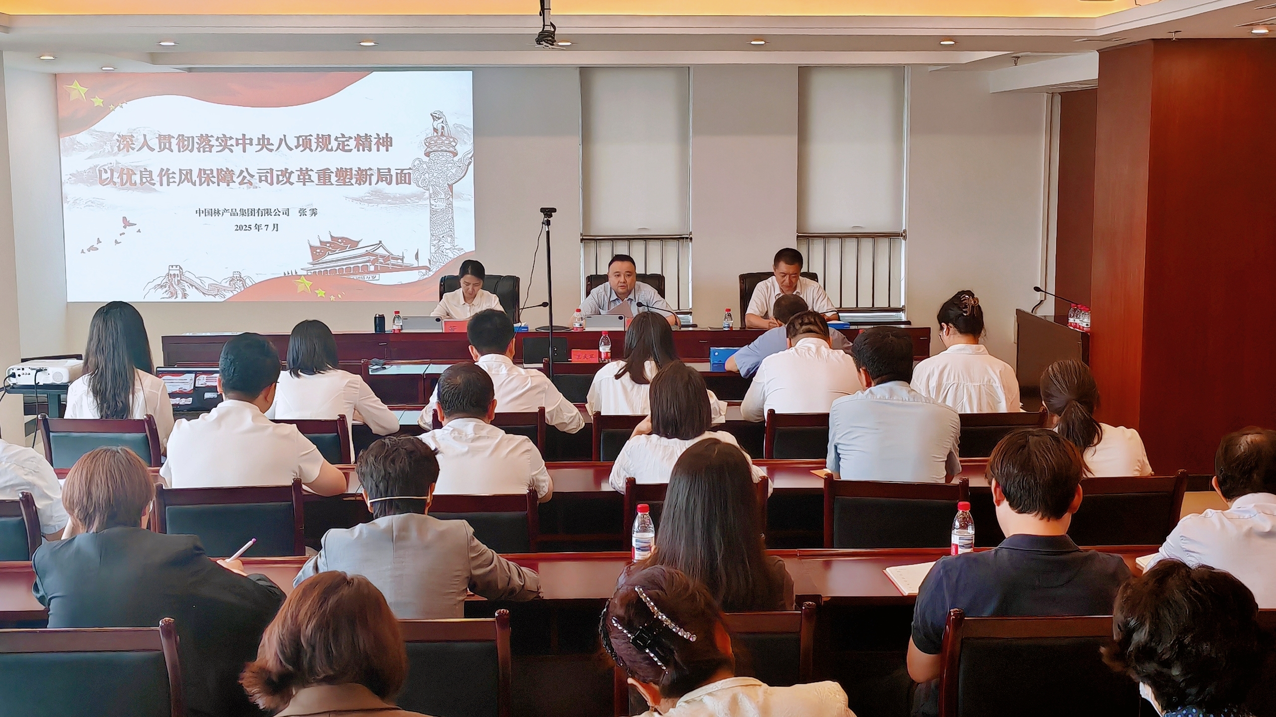 7月15日上午,林产品公司召开深入贯彻中央八项规定精神学习教育警示教育大会暨专题党课。公司党委书记、执行董事、总经理张霁出席会议并为公司党员干部讲授深入贯彻中央八项规定精神学习教育专题党课。公司纪委书记陶立民通报中林集团纪委第二派驻纪检组查处违反中央八项规定及其实施细则精神典型案件及2025年上半年典型案件。公司副总经理董芳主持会议并传达学习习近平总书记关于加强党的作风建设的重要论述、传达学习国务院国资委深入贯彻中央八项规定精神学习教育读书班(第二期)暨国资央企警示教育会精神和中国林业集团深入贯彻中央八项规定精神学习教育警示教育大会精神。公司领导班子成员参加会议。
