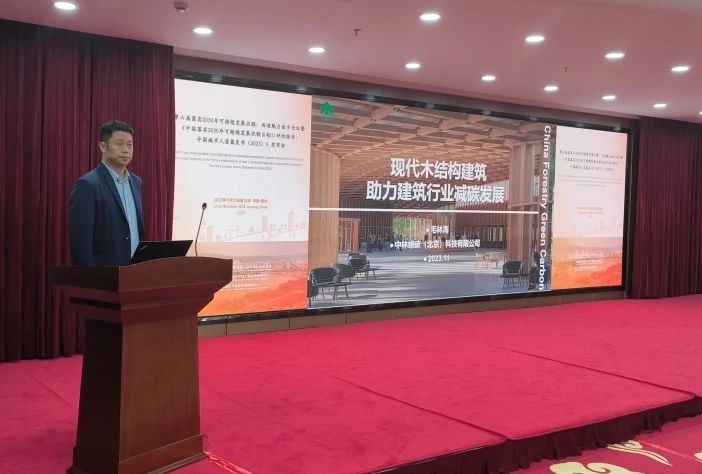 会上,来自中国可持续发展研究会、联合国人居署、联合国粮食计划署、世界银行等机构代表和政府组织代表共同探讨和交流中国落实2030年可持续发展目标11的相关议题,并发布了《中国落实2030年可持续发展议程目标11评估报告:中国城市人居蓝皮书(2023)》(中英文版)。报告发布后,中林绿碳(北京)科技有限公司总经理、国城市科学研究会木结构建筑专业委员会副主任委员、中国住建部中国现代木结构项目专家组成员毛林海以《现代木结构建筑助力建筑行业减碳发展》为题进行主题演讲。