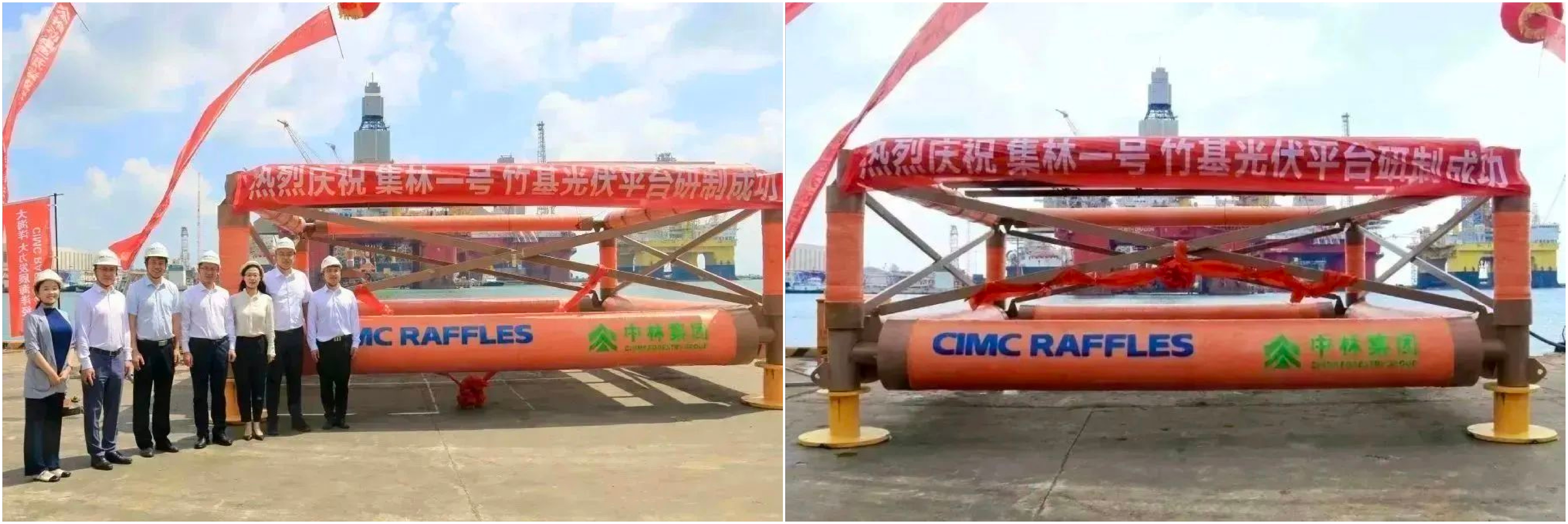 其中,中林绿碳与中集来福士集团联合研发的国内首个竹基海上光伏平台——“集林一号”创新地利用竹材取代了传统漂浮式水上光伏系统中的高密度聚乙烯浮体和钢制焊接结构体,既有效节约了成本,又保护了海洋生态环境,真正实现了“绿电绿造”的目标。