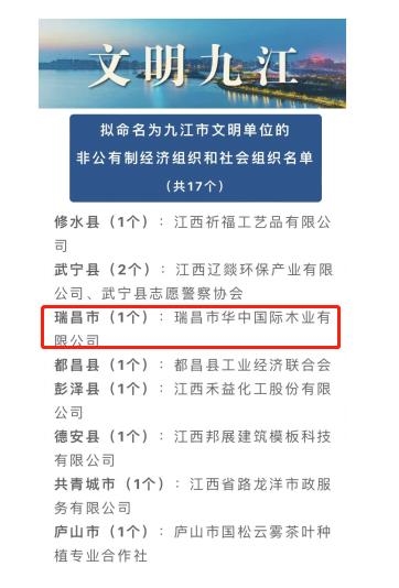 瑞昌华中国际木业荣获“九江市文明单位”荣誉称号 |