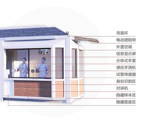 核酸采样“小木屋”内部配置了标准采样工位、通风净化系统、正压新风系统,以及紫外线消杀设备等,打破了传统核酸采样站搭建时间长、检测环境重复消杀的局限性,并在大大改善医务人员和志愿者工作环境的基础上,极大地减少了人员交叉感染的风险。