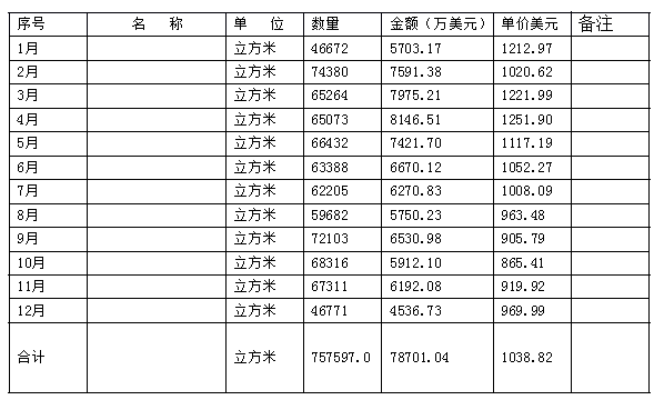 从以上数据中我们可以看出,2012年我国进口的红木原木与锯材量与上年同比,数量与价值均有较大增长。 2013年一季度共进口红木原木25.02万立方米。价值金额23920.10万美元,平均单价956.12美元,折合人民币约为5927.93元。2013年一季度共进口红木锯材1.68万立方米。价值金额2617.08万美元,平均单价1555.75美元,折合人民币约为9645.65元。2013年一季度我国进口红木原木和红木锯材详情见(表三)和(表四)。 2013年一季度进口红木原木统计表(表三)