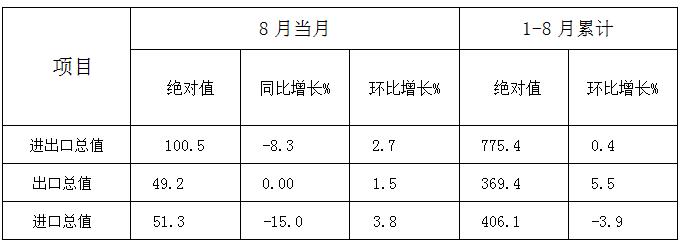 根据海关统计数据汇总分析,2012年1-8月全国林产品进出口总值为775.4亿美元,同比增长0.4%。其中进口406.1亿美元,同比下降3.9%,出口369.4亿美元,同比增长5.5%。8月份当月,全国林产品进出口总值为100.5亿美元,同比下降8.3%。其中进口51.3亿美元,同比下降15.0%,出口49.2亿美元,同比增长0.02%。(详见下表)。