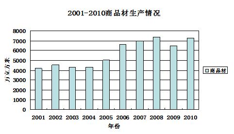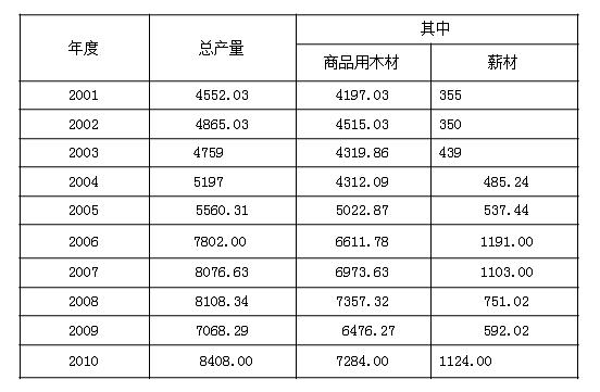 表一 2001年—2010年我国商品木材产量表 单位:万立方米