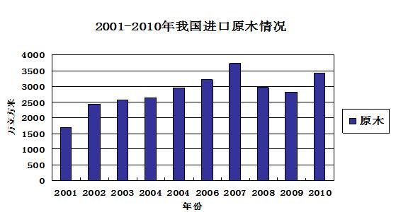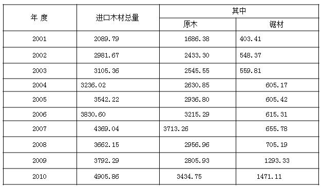 3.我国木材的进口情况 近十年来,我国进口木材总量翻番,2010年全年共进口木材4455.39万立方米,比2001年增长113.20%,这是近十年来的进口木材量最高的一年。详细情况见表二
