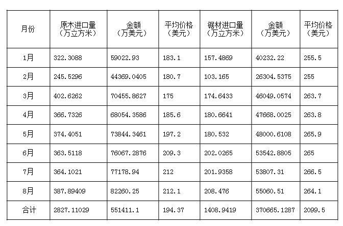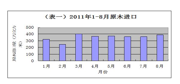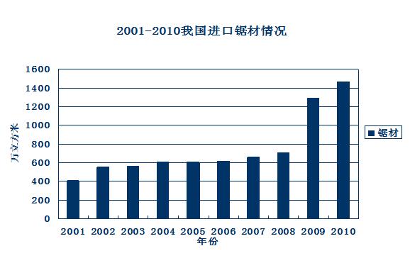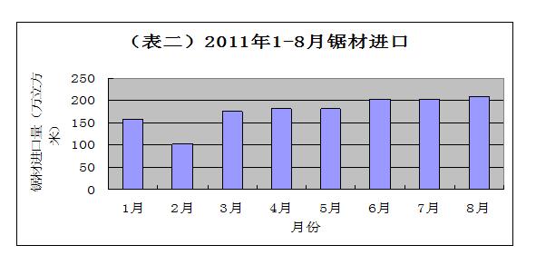 2010年我国进口木材总量中,原木和锯材进口量达4455.39万立方米,同比增长17.5%。其中原木进口3434.75万立方米,同比增长22.4%,锯材进口1471.11万立方米,同比增长13.7%。原木进口量接近金融危机前的水平,锯材进口量达到了近10年来的最高值。 2011年1-8月,我国原木进口2827.11万立方米,同比增长30.23%。锯材进口1408.94万立方米,同比增长44.91%。可以看出锯材进口的速度是很快的。