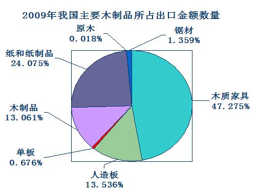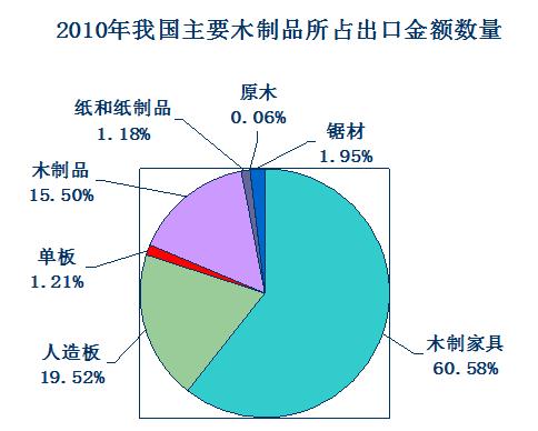 4、 2010年我国林产品的出口情况分析 2010年我国木制品出口方面依然以家具、人造板与单板、木制品、纸与纸制品为主。其中木制家具出口金额105.5721亿美元,人造板(包括胶合板、纤维板、刨花板)出口金额34.0214亿美元,单板出口金额2.1086亿美元,木制品出口金额27.0073亿美元,纸与纸制品(不包括印刷品)出口金额2.0504亿美元,。 另外原木出口量为 2.8382万立方米,出口金额1052.62万美元,比2009年有所增加。锯材出口量为53.3141万立方米, 出口金额34037.84万美元,出口量与2009年相比有所减少。2010我国主要木制林产品出口数量见下图与(表三)。