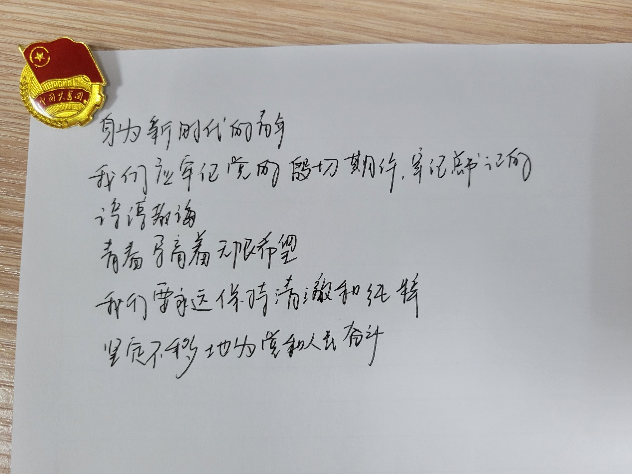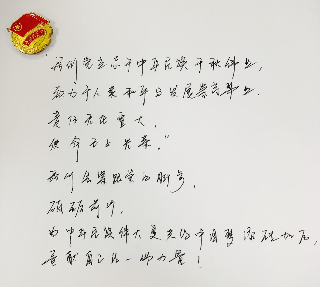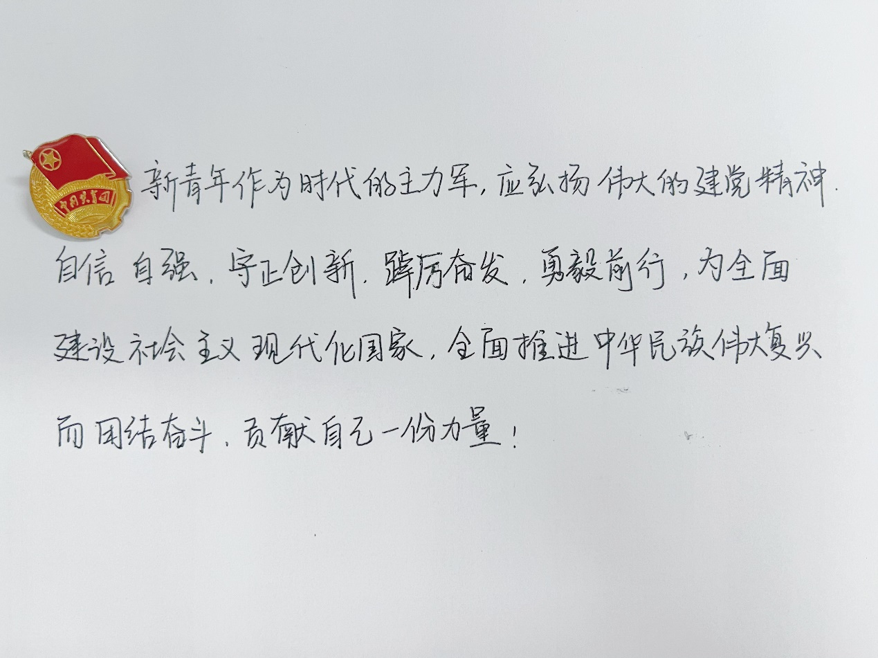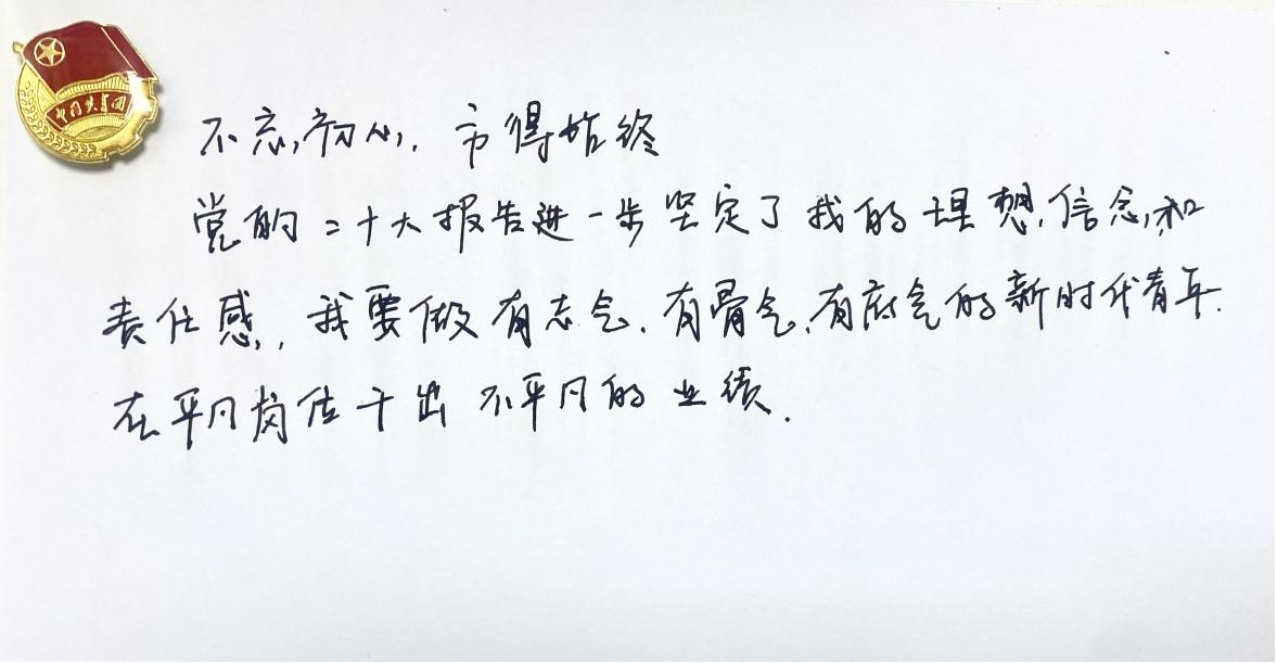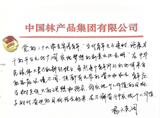 字里行间家国情 林产品公司广大青年团员们,通过对党的二十大精神的学习有了深深的感悟,他们执笔着墨,对着闪耀的团徽,写下自己个人感悟,在字里行间中,表达自己的家国情怀。 △林产品公司团委-杨天英阔