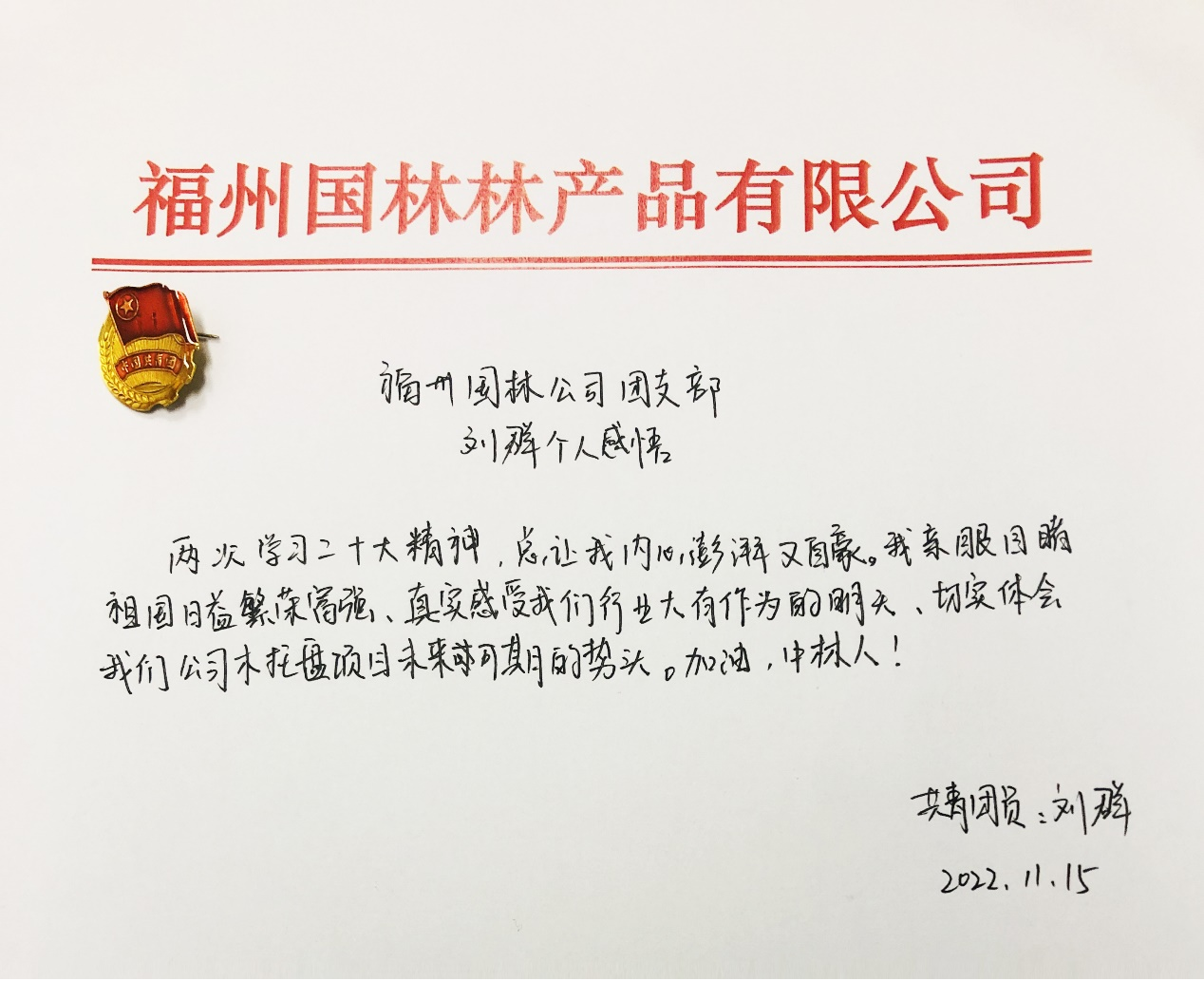 △厦门国林林产品有限公司团支部 厦门国林团支部开展了党的二十大精神学习活动。此次团支部学习活动是对全体职工动员部署大会的补充跟进,亦是对二十大精神的学习。本次学习活动对团员职工提出了如下要求,一是紧跟党的领导,以党员职工为表率;二是学习贯彻落实二十大会议精神,多角度、全方位、深层次参与学习;三是后续定期开展交流感悟、分享心得、研讨学习。 习近平总书记说过,青年是建设社会的青年,青春是孕育希望的青春。时代总将历史责任赋予青年,唯有坚定不移跟党走,全心全意为人民,方能不负韶华,永远青春。