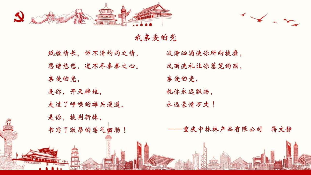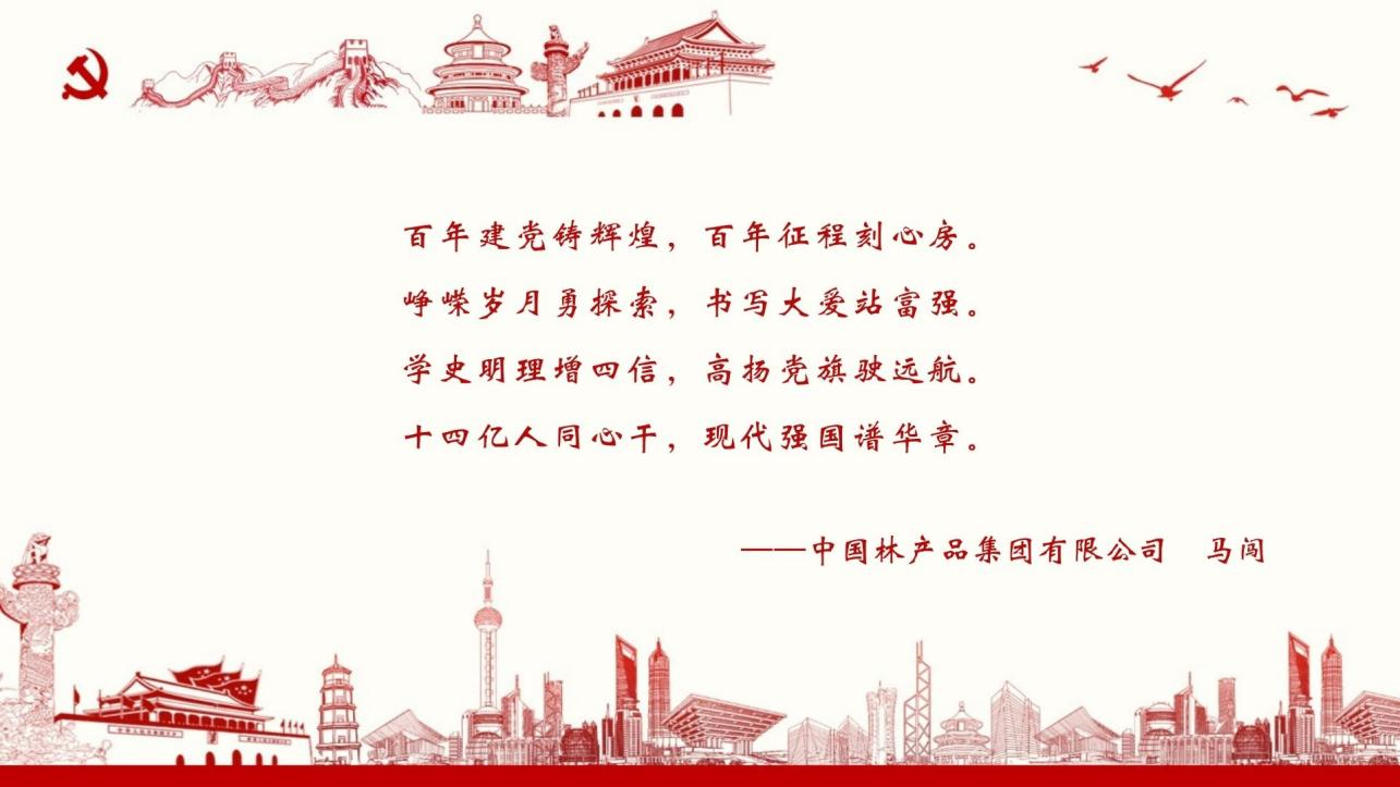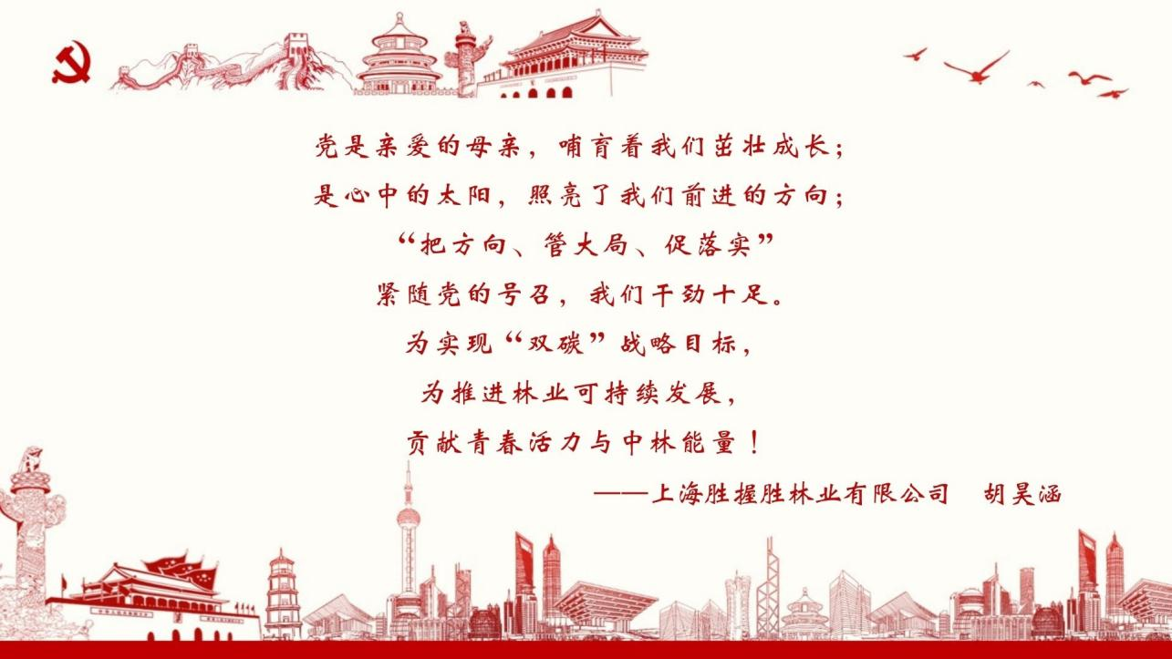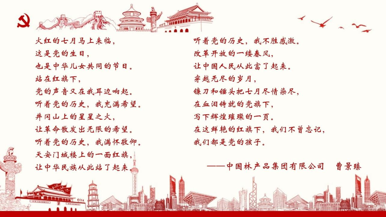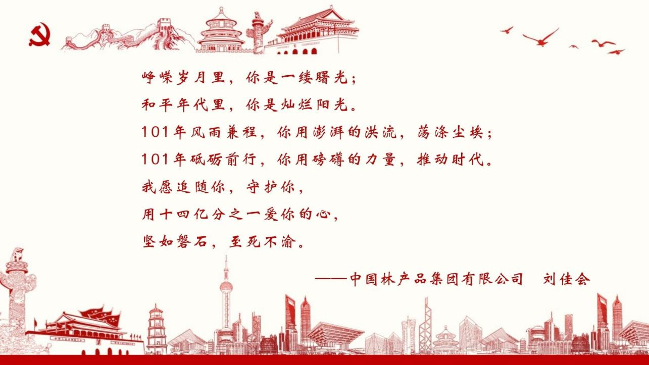 编者按:为迎接党的二十大胜利召开,大力营造团结奋斗、自信自强、国泰民安的浓厚氛围,庆祝中国共产党成立101周年,为激励各级党组织、团组织和广大党员、团员、青年继承发扬党的光荣传统,中国林产品集团有限公司党委坚持党建带团建,组织开展“喜迎二十大 永远跟党走 奋进新征程”系列活动。 执笔以颂,吐灼灼之情;行笔至此,诉婉转情思。本期开展的是“纸短情长,献书向党”诗文征集活动,林产品公司及所属各级次企业党员、团员们献上对党的告白寄语,充分表达对党的赤子之心、对祖国的挚爱之情、永远跟党走的坚定信念,以及为生态文明建设贡献力量、奉献青春的坚定决心。