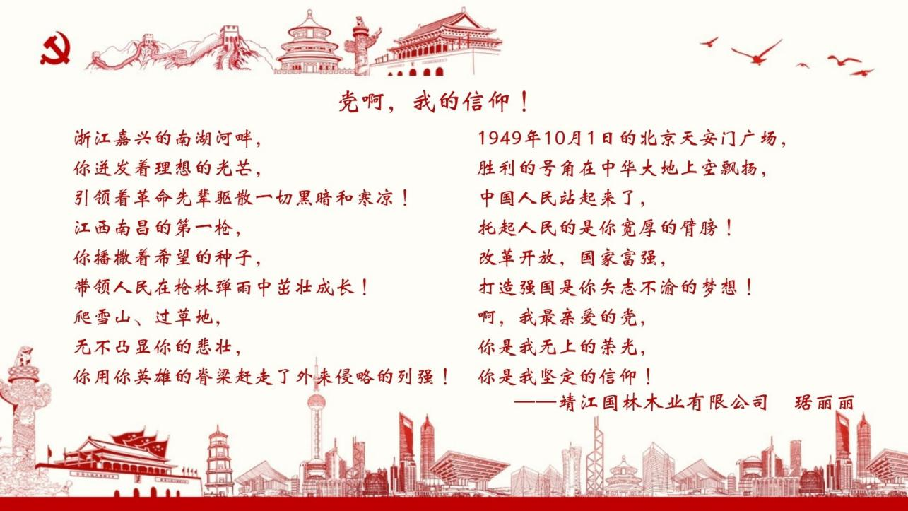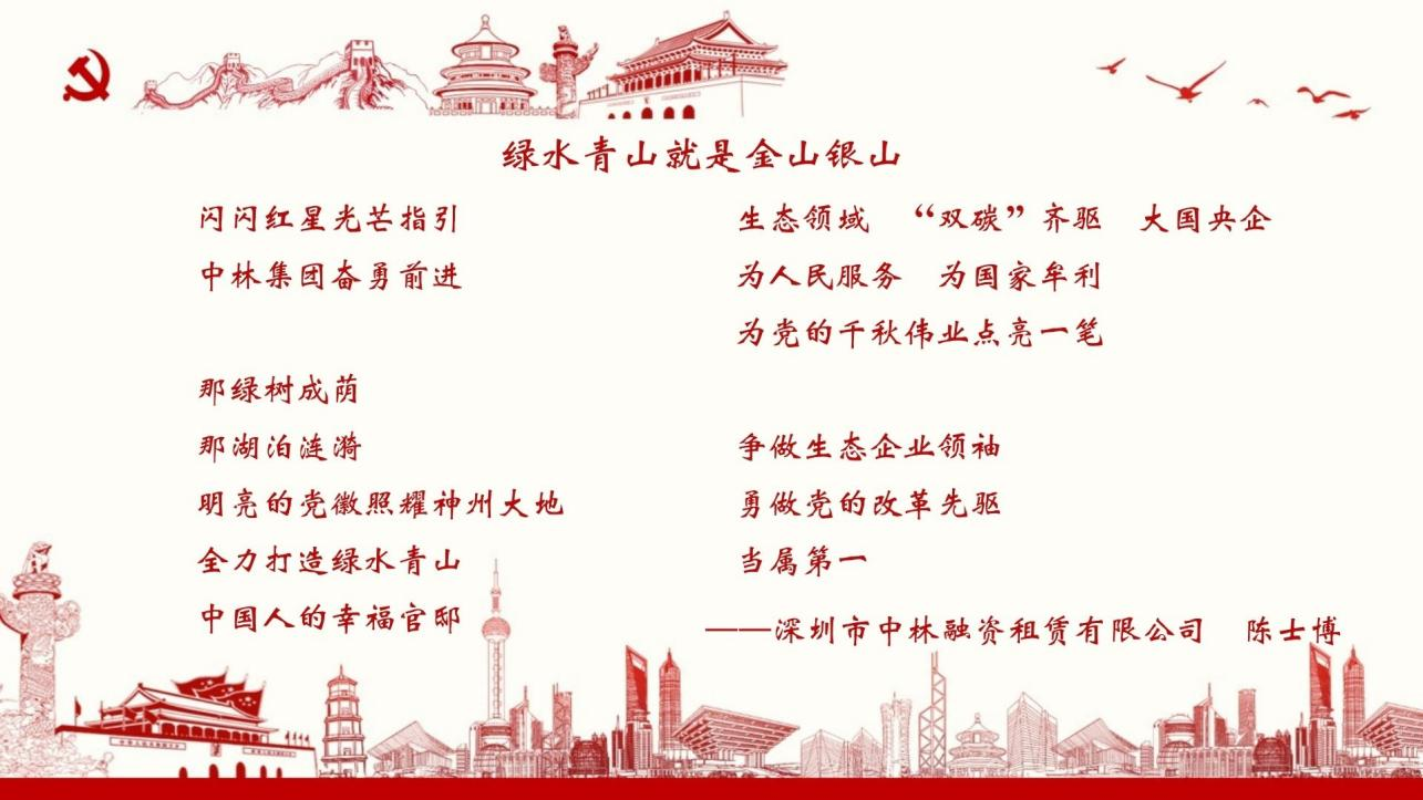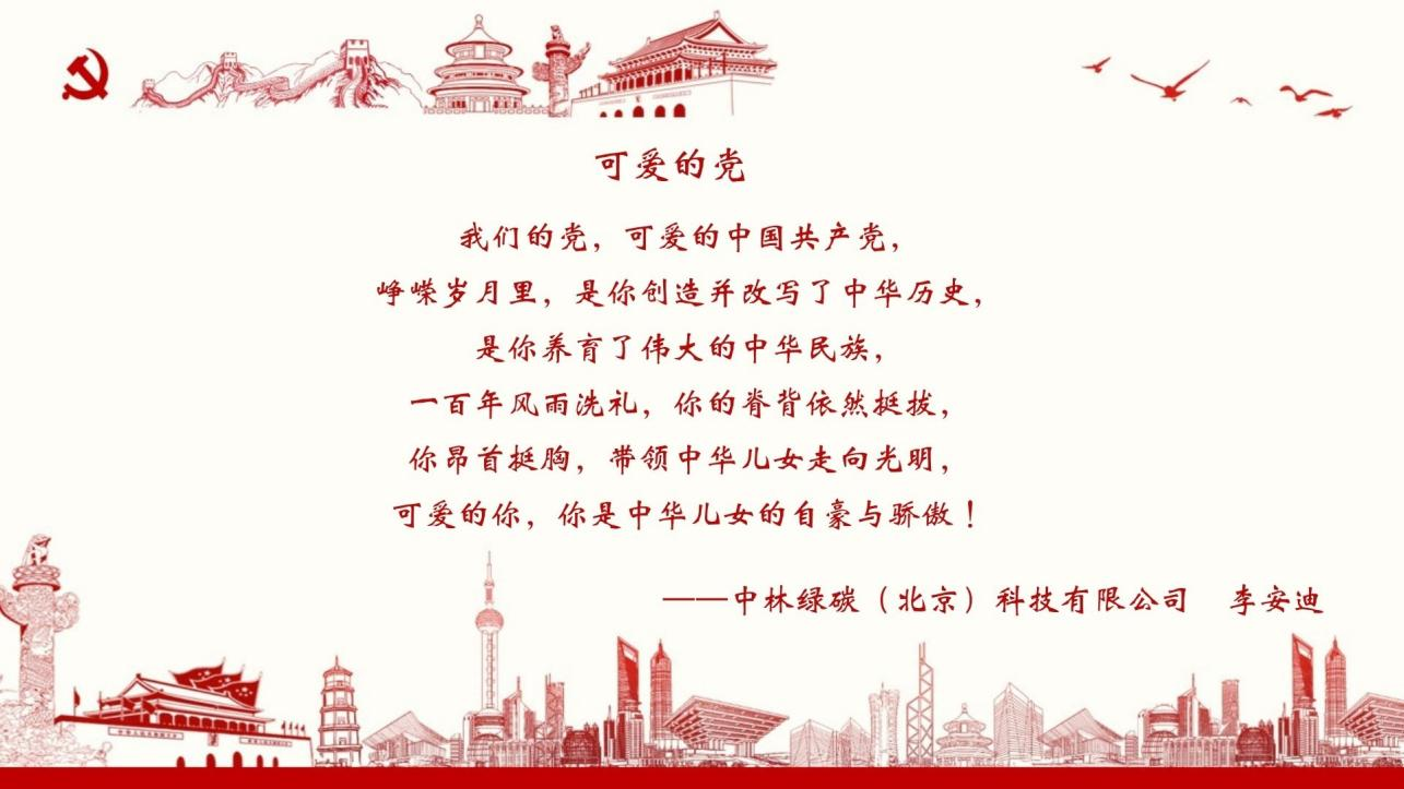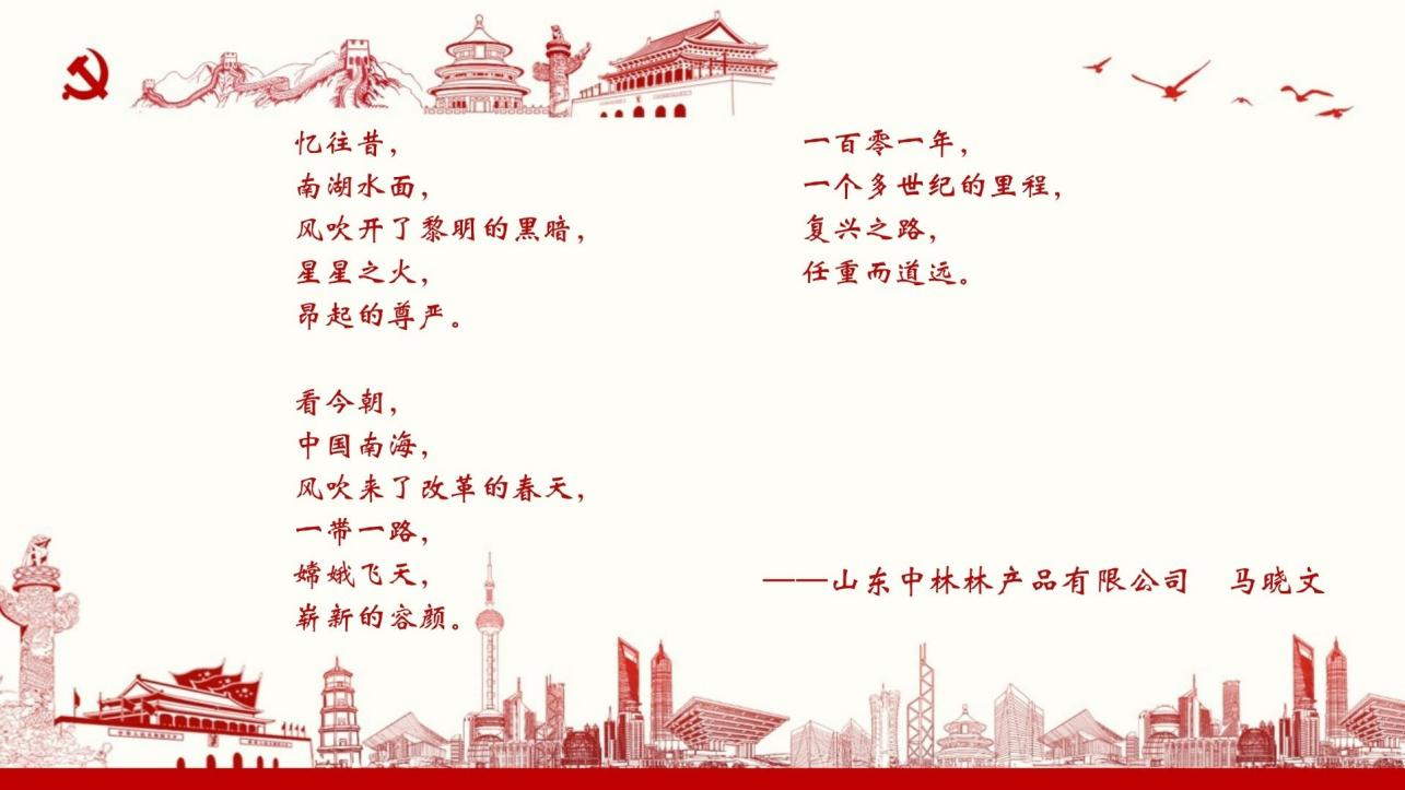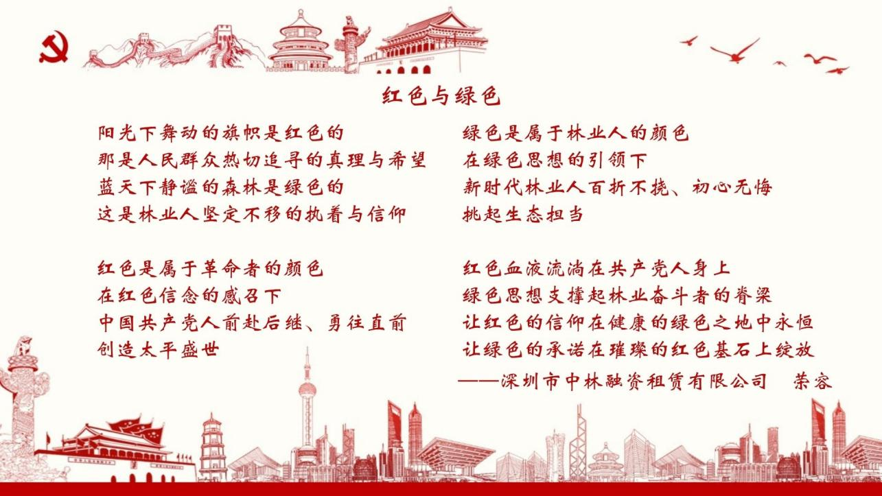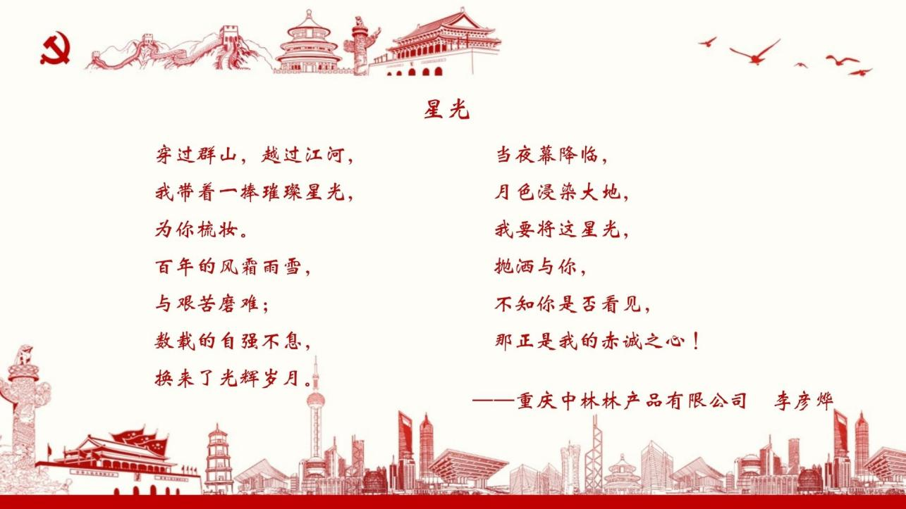 编者按:为迎接党的二十大胜利召开,大力营造团结奋斗、自信自强、国泰民安的浓厚氛围,庆祝中国共产党成立101周年,为激励各级党组织、团组织和广大党员、团员、青年继承发扬党的光荣传统,中国林产品集团有限公司党委坚持党建带团建,组织开展“喜迎二十大 永远跟党走 奋进新征程”系列活动。 执笔以颂,吐灼灼之情;行笔至此,诉婉转情思。本期开展的是“纸短情长,献书向党”诗文征集活动,林产品公司及所属各级次企业党员、团员们献上对党的告白寄语,充分表达对党的赤子之心、对祖国的挚爱之情、永远跟党走的坚定信念,以及为生态文明建设贡献力量、奉献青春的坚定决心。